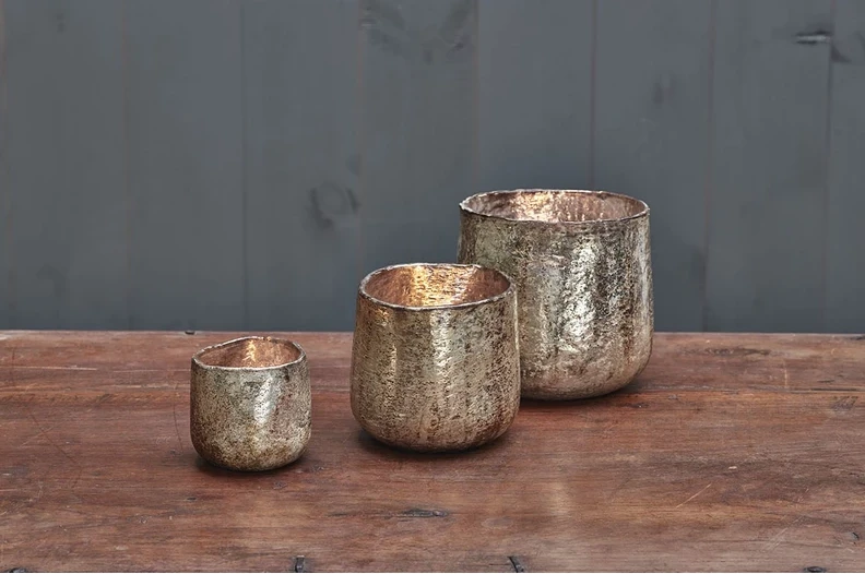 Set a sophisticated, understated scene with these attractive Aban T- light holders; their rustic gold finish is enhanced with the textured glass material. The rustic tones soften the candle light helping to create an ambient, intimate mood.