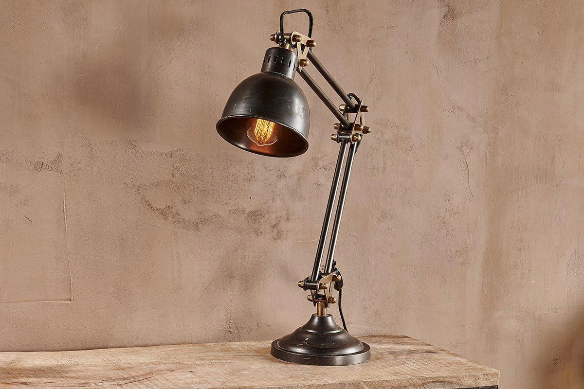 Our akono desk lamp has a sophisticated aged bronze finish, this gives a modern antique look. It makes an ideal desk accessory and quirky bedside light. The lamp has an adjustable head and the cable is black fabric.