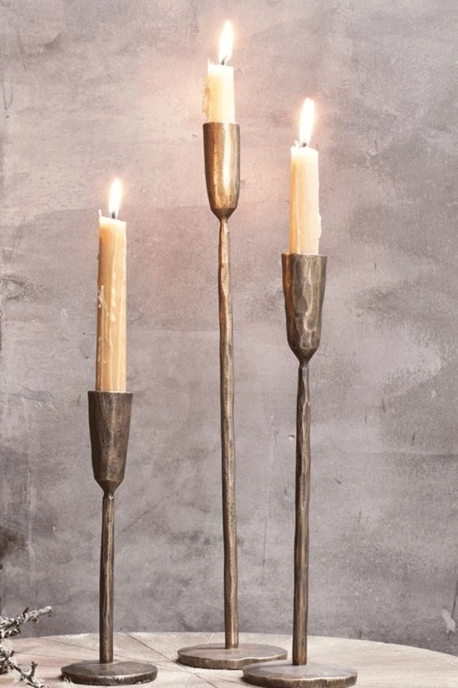 This iron Mbata Candlestick by Nkuku has been elegantly created with a thin stem and candle holder at the top for a standard dining candle. It has been finished with brass, which gives a rustic edge and distinct style. Think about adding medium or large Mbata Candlesticks to your collection, so that you can create an attractive display of different heights. Available in small, medium and large. Candlestick Solid iron with brass finish Small: 20 x 6.5cm (dia) Medium: 30 x 8cm (dia) Large: 40 x 9.5cm (dia) Product code: 38208