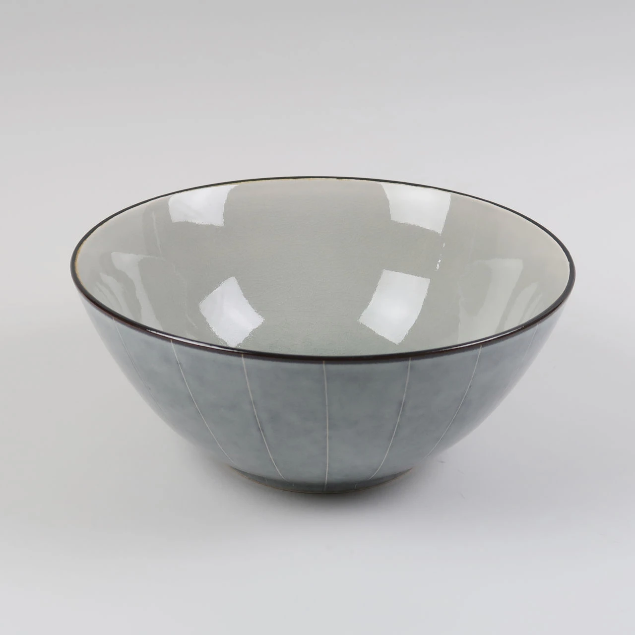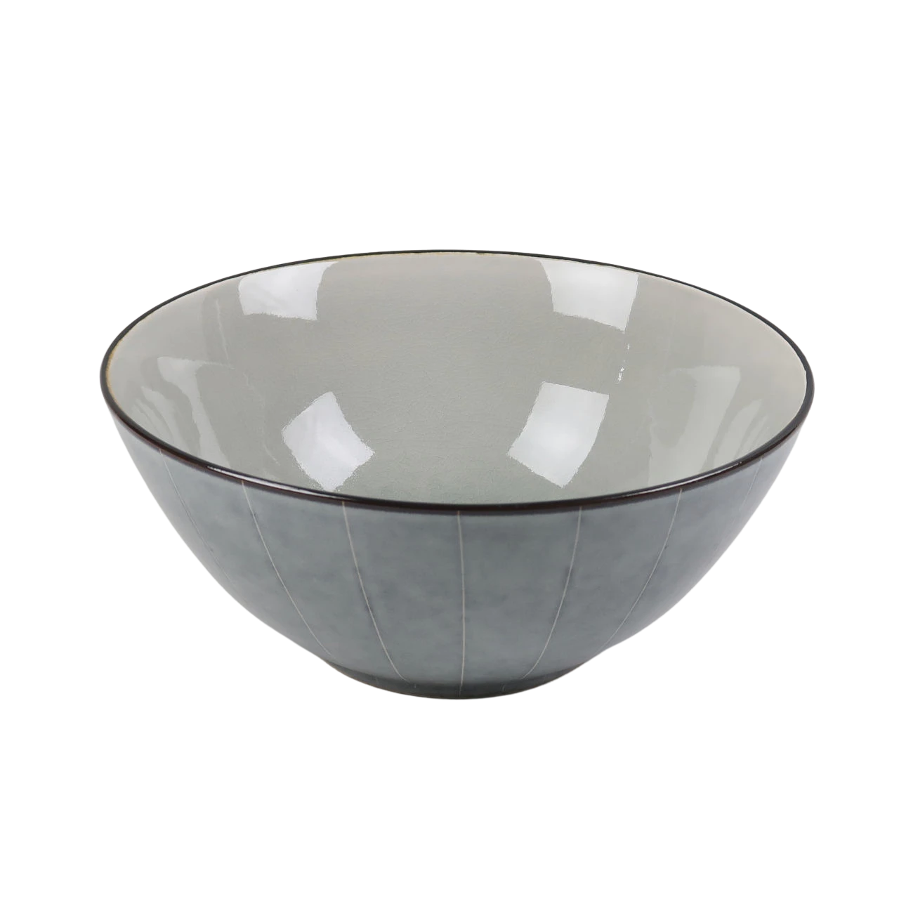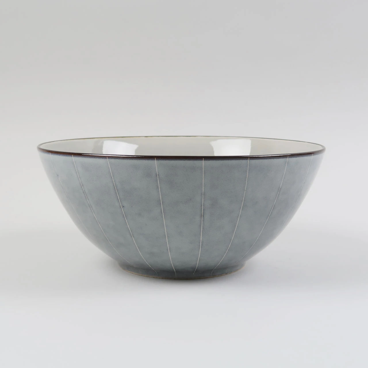 This ceramic bowl has an interior that is not one solid grey colour but is instead a range of muted tones of grey. The external surface of the bowl has scored lines that run from the top to the bottom of the bowl and the external colour is a mottled blueish grey colour.