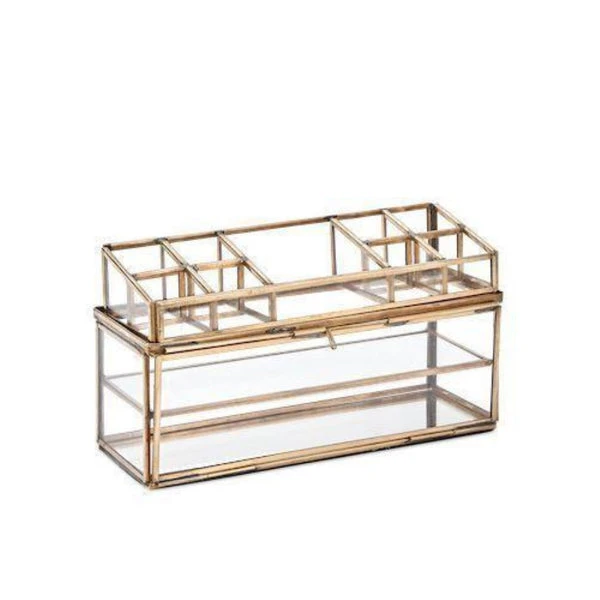 The Bequai open jewellery box is made up of stylish compartments that fit neatly together in an elegant box. The well-designed segments are suited to holding all types of jewellery. The metal is skilfully soldered around the glass with traditional tools; this handmade process means that there are weld marks on the joins of each piece, a feature that we love as it tells the story of how the product is made. Antique gold finish Made from Brass H 13cm x W 23cm x D 8cm Made in India Nkuku was founded on the back of a life-changing adventure for Ali and Alex Cooke when they set off on a year-long round the world trip. From the outset they were inspired and humbled by the talented craftspeople and their beautiful work they saw. It then encouraged them to do something different, so on their return, they moved to rural Devon and started working with artisans throughout the world, supporting and celebrating their skills by bringing their products to a wider audience.