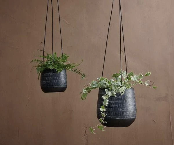 The eye-catching pattern on these hanging planters is beautifully crafted by hand. The design gives each one a unique feel and adds to their tactile qualities. The dark metal finish provides a stylish contrast to the verdant greens of indoor plants. The etched patterns on these collections are all made by hand using traditional tools. The patterns mix traditional influences with new designs. The handmade nature means that honest tool marks may be evident in each product. 13.5cm x 14.5cm