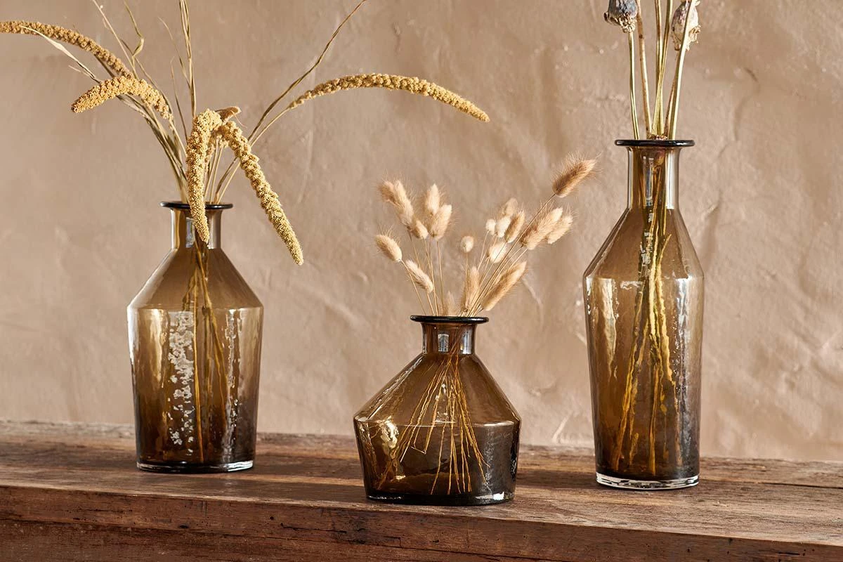 Charming and individual in feel, these attractive glass vases have an asymmetric shape. Handblown into a simple mould, the irregular shape is enhanced with the subtle earthy brown tone. Style different shapes and heights together for an attractive display; fill with dried flowers, foliage or vibrant blooms.