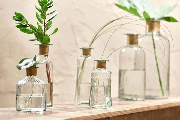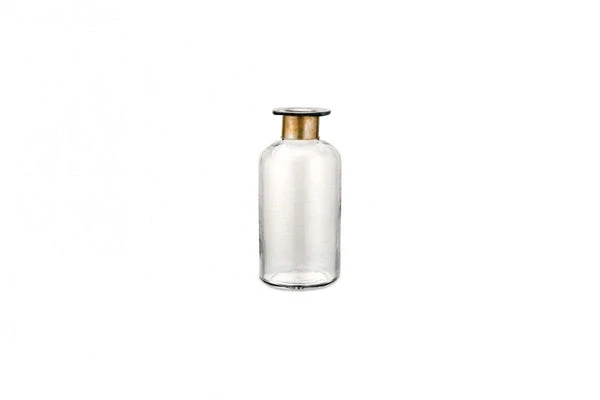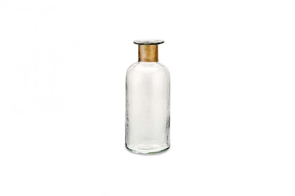 Our Chara bottles are full of sophisticated rustic charm; these artisan made pieces involve hammering the glass with traditional tools providing a subtle textured affect. The glass is skilfully blown through the brass ring creating this elegant shape. Solder marks are often evident on the brass as a result of this complex handmade process. Solder marks are often evident on the brass as a result of this complex handmade process. We use recycled glass to make these collections. Firstly, the waste glass is collected and washed to remove any impurities; it is then crushed and melted down before being hand blown or placed in moulds to create beautiful new products. Dimensions (H x W x D) Small – 31.5 x 12 x 12cm 1.3kg Large – 39 x 17 x 17cm 3.1kg Country of origin India Primary material Glass Secondary material Brass Capacity Small – 2375ml Large – 7000ml