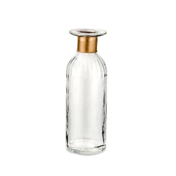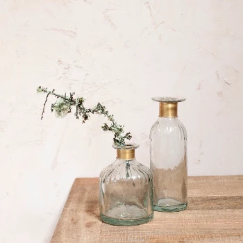 These elegant Chara bottles from Nkuku are skilfully made by artisans by blowing glass through the brass ring. The glass is then hammered and etched to create the decoration. Due to the way they are made there can be solder marks left on the brass but this all adds to their rustic charm. These sophisticated bottles come in two elegant shapes.
