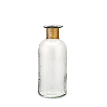 These beautiful hand blown and hammered glass bottle vases from Nkuku are handmade by artisans. They have a textured finish which adds to their charm and character. Occasionally burn marks are evident on the brass ring due to the complex processes involved in making these hand blown items. It all adds to their unique rustic finish.