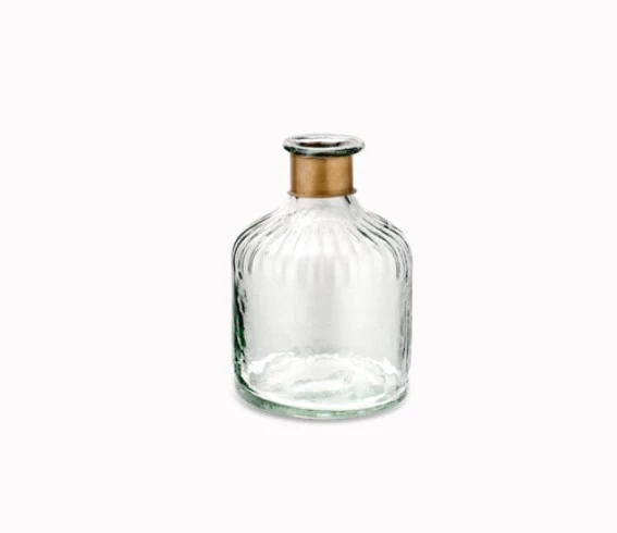 These elegant Chara bottles are decorated with a hammered glass finish and etched detail. The bottle is skilfully created by blowing glass through the brass ring. This does mean there are sometimes solder marks on the brass.