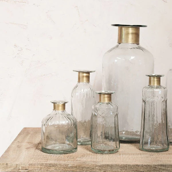 These elegant bottles are decorated with a hammered glass finish and etched detail. The bottle is skilfully created by blowing glass through the brass ring in this stylish design. Perfect as a stand alone ornament, or used as a vase for a single stem bloom or botanical spray. Clear & Antique Brass Small Hammered Bottle Vase. Dimensions approx. 15cm (H) x 11cm (Diameter) x 800ml. Made from brass and recycled glass. Recycled glass: The waste glass is collected and washed to remove any impurities; it is then crushed and melted down before being hand blown or placed in moulds to create beautiful new products. Please note: Solder marks are often evident on the brass as a result of the handmade process. A unique detail that gives each bottle an individual character.