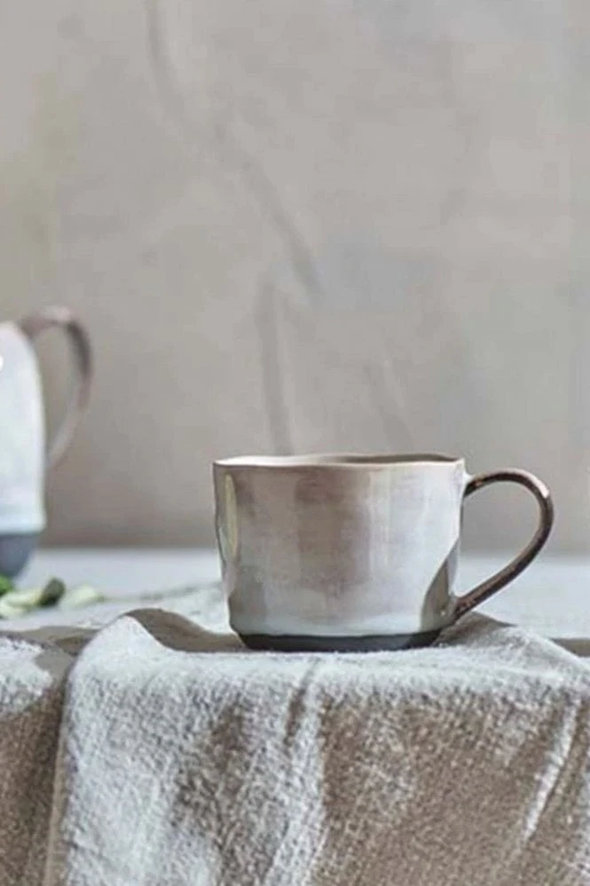 Nkuku Edo Short Mug Slate Stoneware mug Slate coloured terracotta base Smooth off-white glaze Created by talented artisans in China 195ml 6.5 x 8cm Food Safe Dishwasher Safe Microwave Safe Not Oven Safe 40476