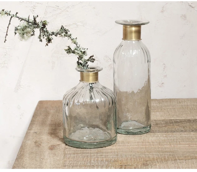 Hammered glass bottle with antique brass ring around the neck. Perfect for displaying stems or grouping with other beautiful pieces.
