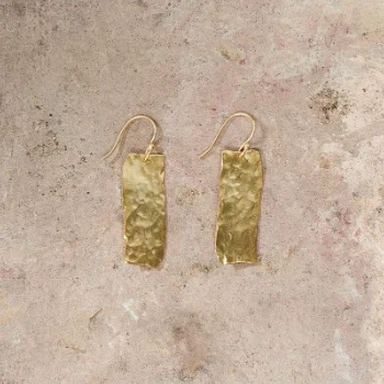 These beautiful Huron earrings from Nkuku have been handmade by artisans in India. All Nkuku jewellery is handmade for them by a fair trade enterprise. It is made from brass plated in 22 karat gold. These stylish earrings are made up of irregular oblong shape with an eye -catching hammered finish that creates a textured surface to the decoration. A simple but stylish design.