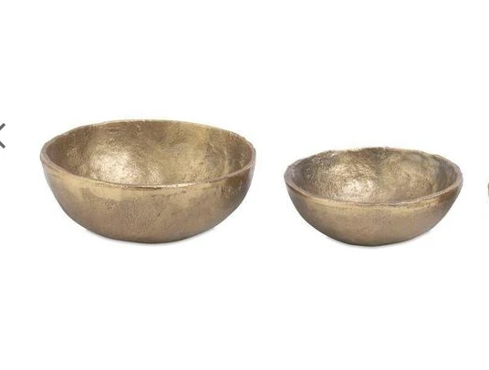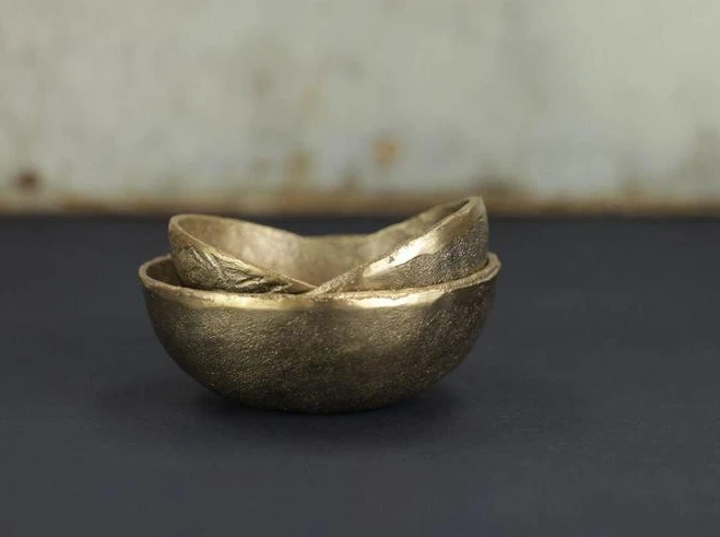 Colour: Brushed Gold Material: Brass Size: 9.5cm x 9.5cm x 4cm Weight: 590g Food Safe: Yes Dishwasher Safe: No Microwave Safe: No Oven Safe: No These sublime Jahi gold bowls are handmade with a golden brass finish and rustic, imperfect rim. They make a beautiful decorative accessory. Decorate with the small Bowl and Plates.