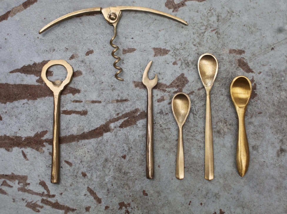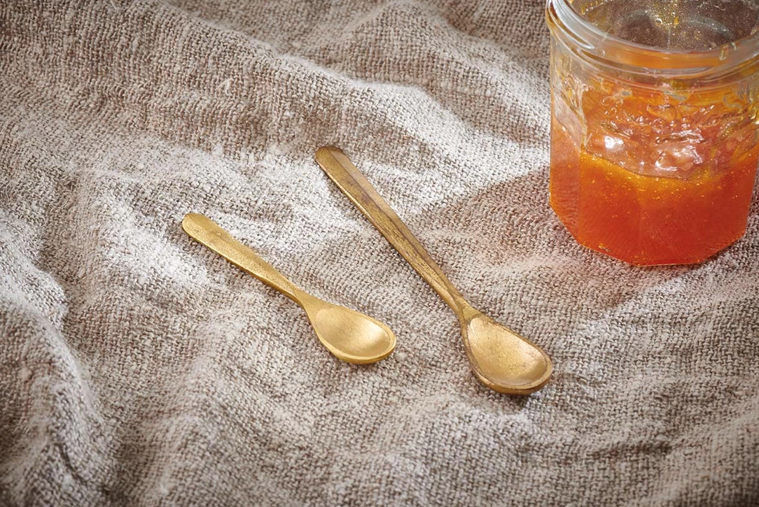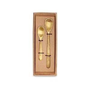 Colour: Brushed Gold Dimensions: 15 cm x 2.5 cm x 1 cm. Small 10cm Materials: Brass Weight: 70g Food Safe: Yes Dishwasher Safe: NO Elegant and perfectly formed, this gift set of Jahi spoons are beautifully crafted from solid brass in this unique shape. Perfect for adding a touch of style to a table.