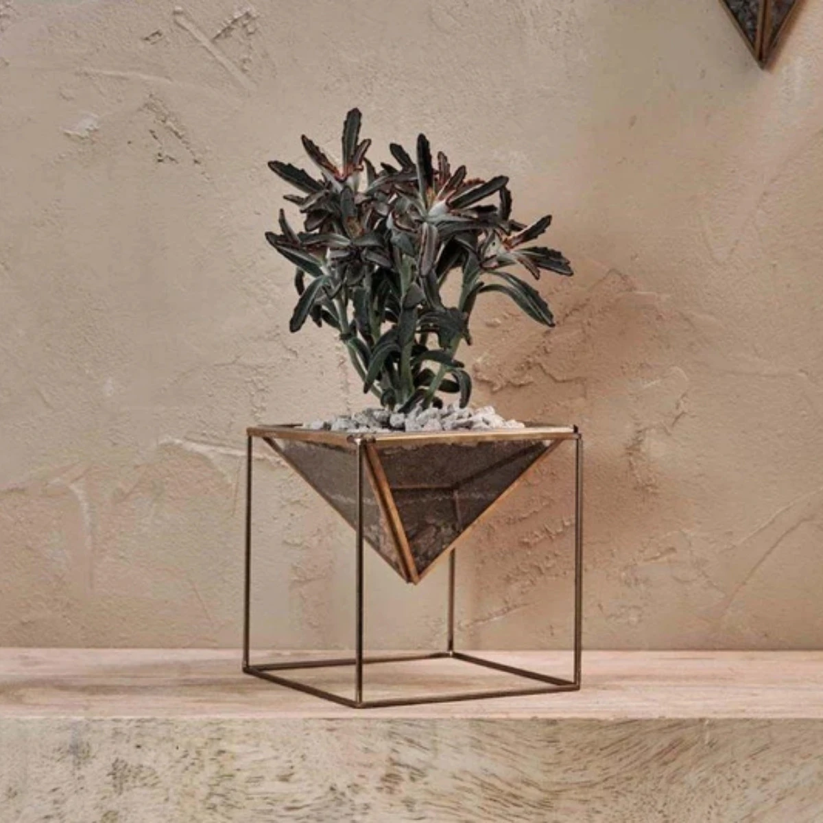 The Karana Planter on stand is made by ethical manufacturer Nkuku and has a striking geometric design. With a glass plant holder and antique black finish to the stand it is specifically suited to succulents and cacti. The Karana Planter would create a stylish table centre piece or a stylish feature on a sideboard or window sill. The planters are not water tight so should not be watered heavily, instead use stones as a base and spray your plant to keep it moist. If you would prefer to use a plant that does need regular watering you could try a waterproof liner. The Karana Planter on Stand measures 16.5cm diameter by 16.5cm tall.