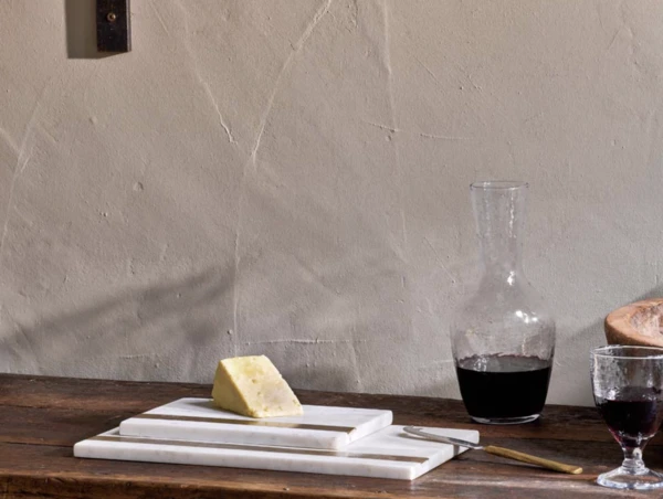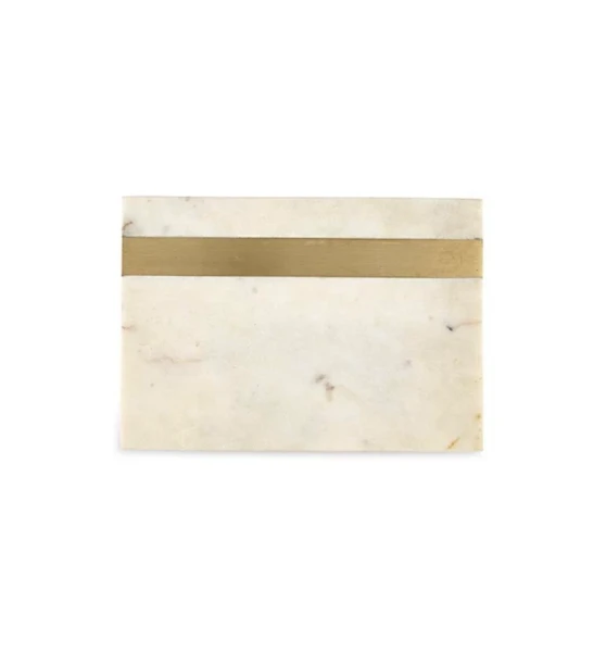 The rectangular shape of the Kasa marble board is enhanced with a wide thread of brass that runs through the marble board. The warm, golden hues of the brass compliment the off-white natural stone to create an elegant board, ideal for displaying and serving sharing foods. Material: Marble and Brass Care: Foodsafe. Handwash only, this item is not dishwasher safe.