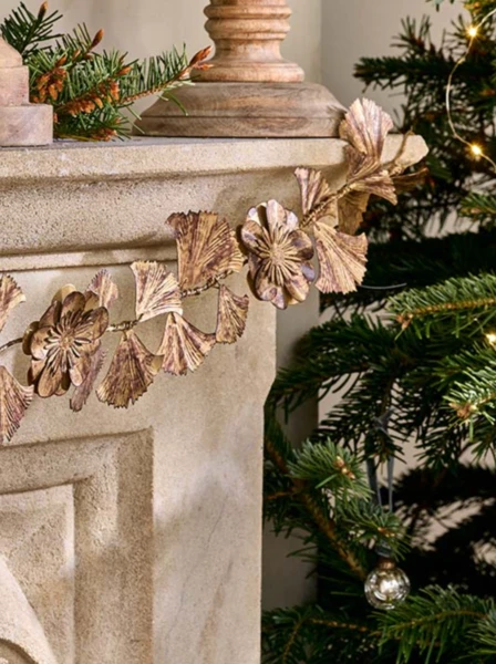 The striking Khamila leaf garland is the perfect addition to a festive scene. The beautifully crafted brass leaves are rich with detail whilst the golden brass tones feel decadent and festive. The abundant collection of leaves are strung along the wire garland to make an interesting and striking display. Dimensions: 130cm x 10cm x 1.5cm