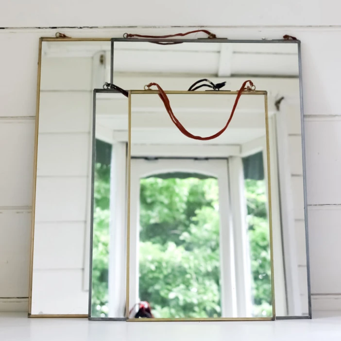 This rectangular mirror, in portrait format, designed by the brand Nkuku is part of the Kiko collection and is characterized by its lightness. It is entirely handmade in India and comes from fair trade. Recycled brass is adapted and welded around the mirror. The links to hang the mirrors are recycled sari. The saris are harvested, washed, cut and sewn to make the thongs. Alone or in combination with other mirrors, frames or other items to hang, it will be perfect to give lightness and a little vintage touch to every room in your home.