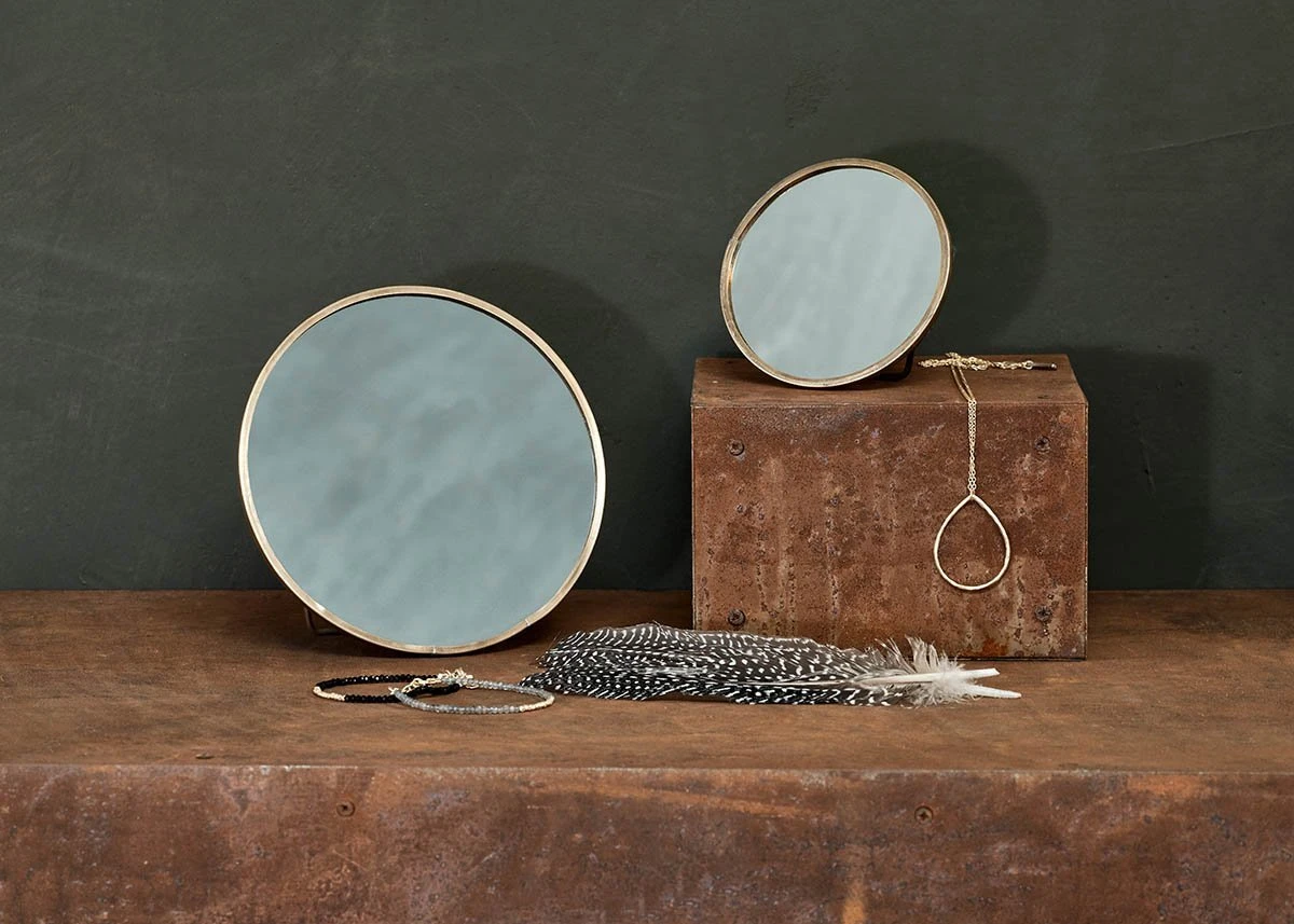 Simple and elegant, these charming Kiko standing mirrors are perfect for a dressing table or sideboard decoration. The circular brass frame has been hand crafted around the mirrored glass in this timeless design.