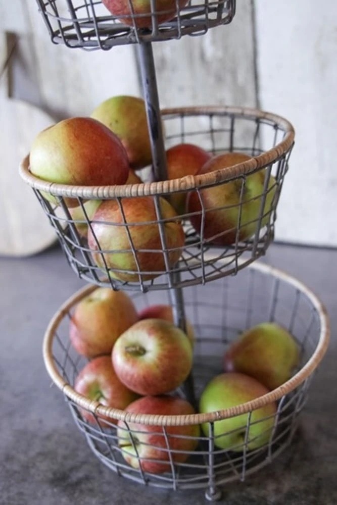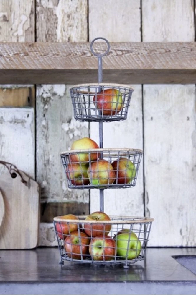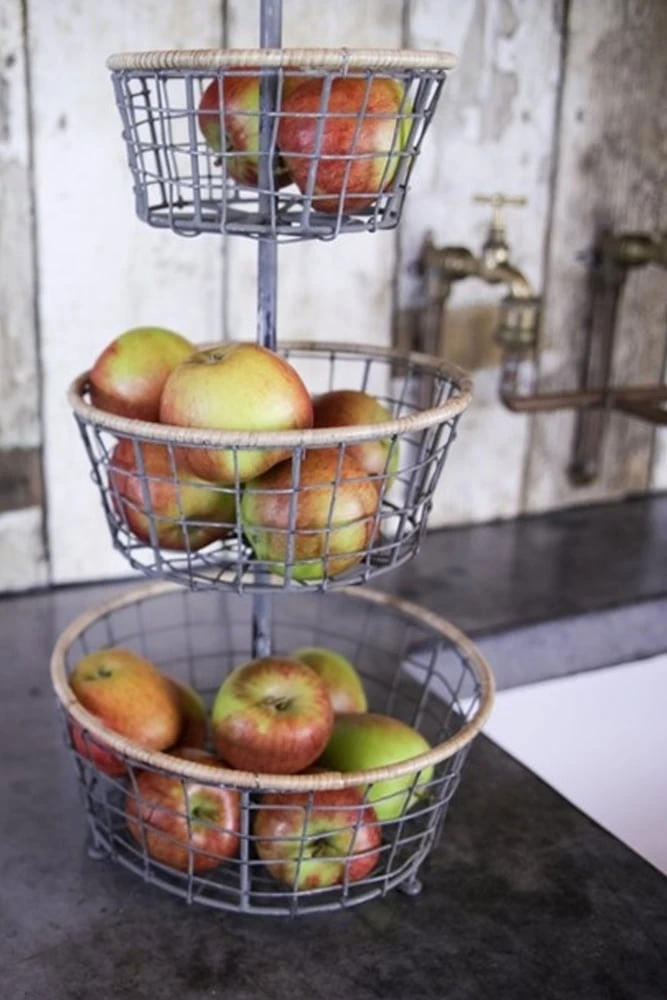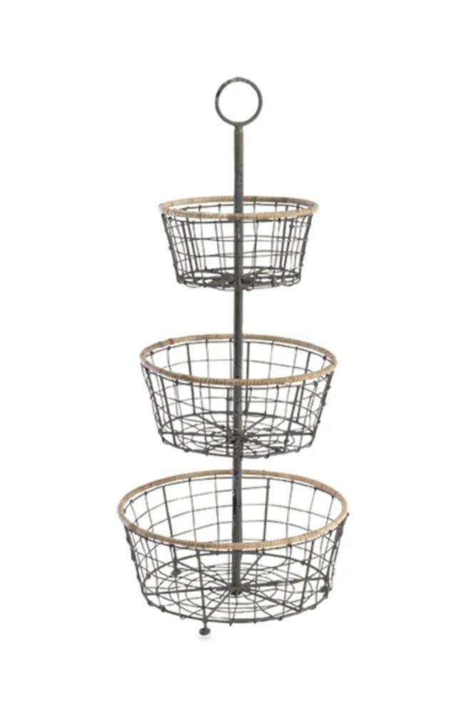 Nkuku Koba Wire Bowl Stand Raffia trims Loop at top 55.5 x 24.5cm (dia) Product Code: 27394 Nkukus Koba bowl stand is perfect for kitchen storage. In a three tiered design, it has been handmade from wire with raffia trims to soften the look. Ideal for holding everything from eggs to fruit and vegetables, the stand is finished with a loop at the top for easy carrying.