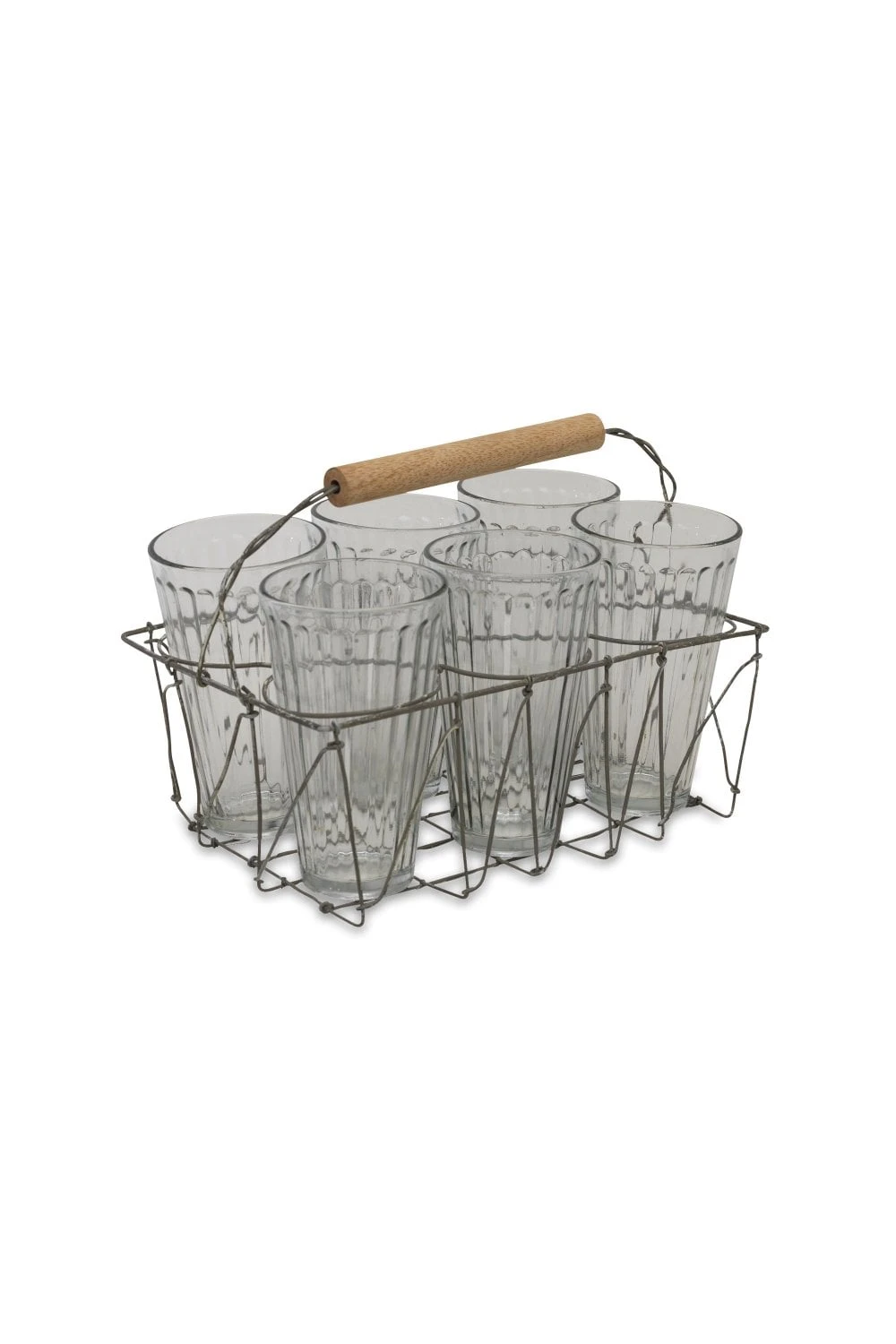 H 20 x W 25 x D 17cm The Large Agar Glass Set from Nkuku features a wire carrier with mango wood handle and holds six glasses that are perfect for entertaining indoors and outside. Inspired by travels around Africa and the Far East where family and friends gather regularly to share tea, this set of glasses are perfect for tea but also make a great option for milkshakes, cordials, wine and water. Set of six Wire carrier Mango wood handle Product Code: 35202 Large Clear Glass