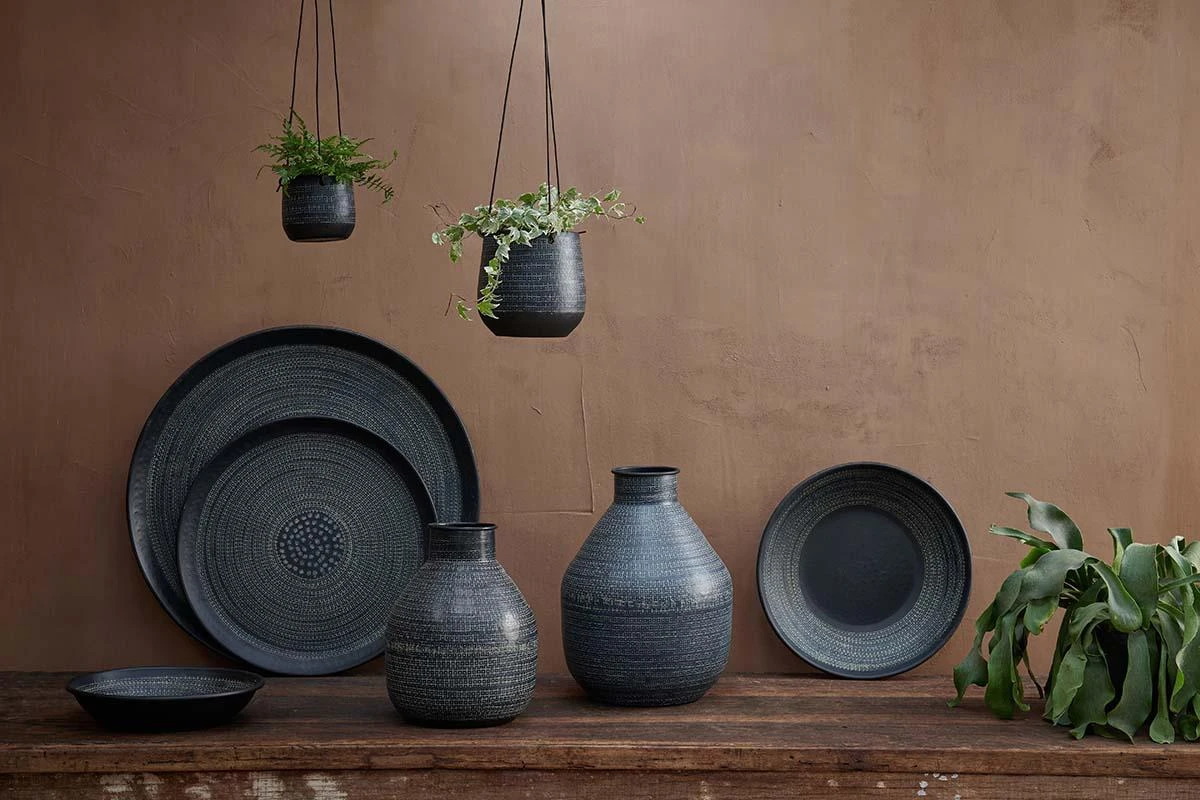 Strikingly imprinted using traditional tools, mahika vases have an eye-catching pattern and soft, organic shape. The matt black finish provides a contrasting backdrop for dried flowers and fresh blooms. Dimension: 33cm x 26cm x 26cm.