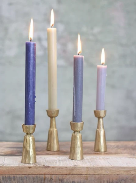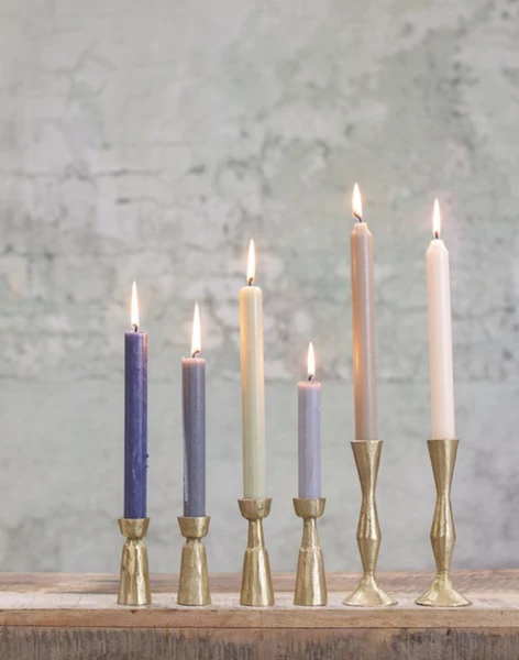 These elegant hand forged brass candlesticks add rustic style to a table or mantelpiece; we love their brushed metal finish. Mix the different heights for an eclectic look. Colour: Brushed Gold Dimensions: 10.5 x 3.5cm Material: Brass Please note, items are sold separately, this listing is for the large candle holder only. Candle not included.