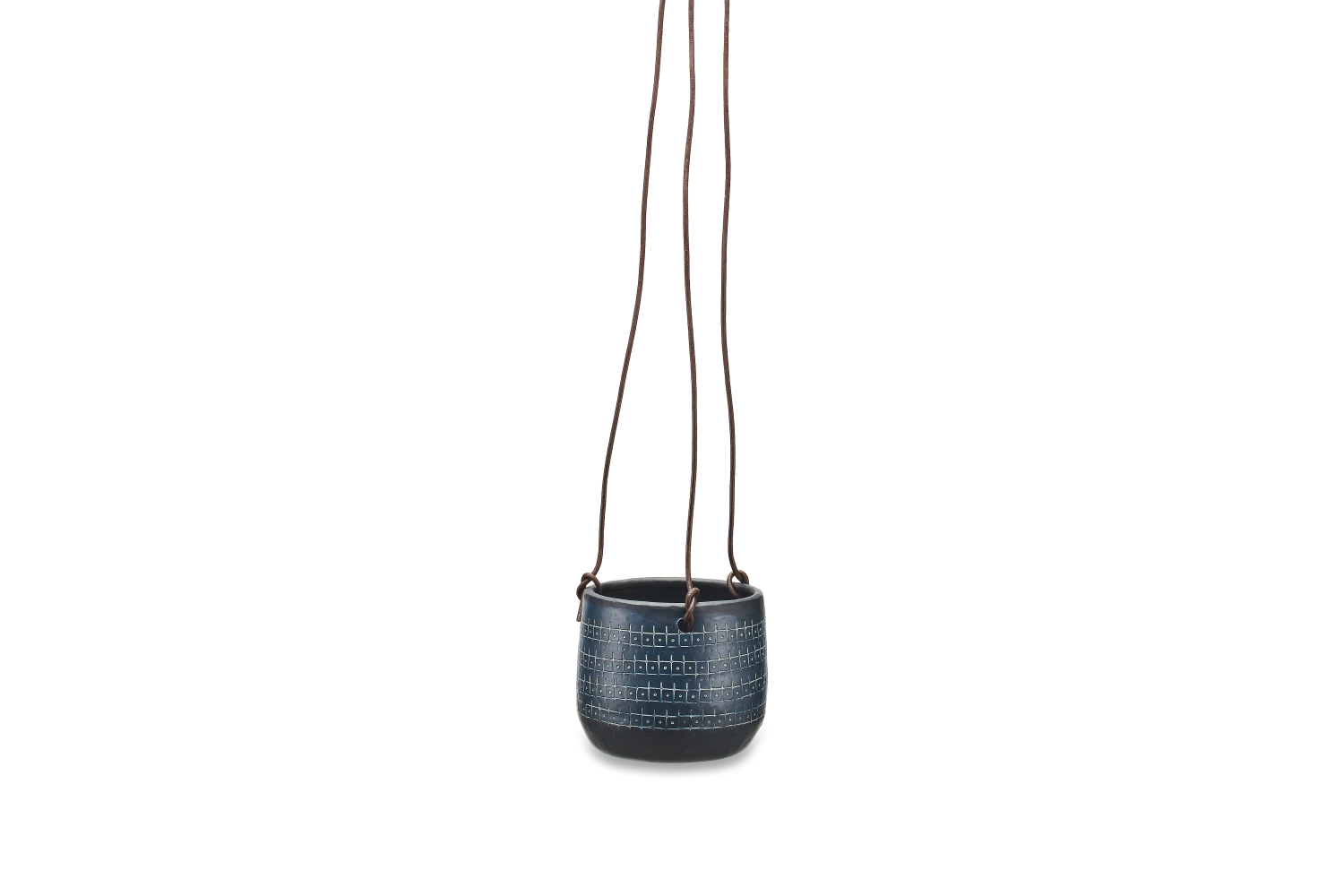 These lovely Mahika hanging baskets from Nkuku are perfect for displaying house plants. The black hand textured pattern on these metal planters makes them unique and contrasts beautifully with green foliage. Available in two sizes.