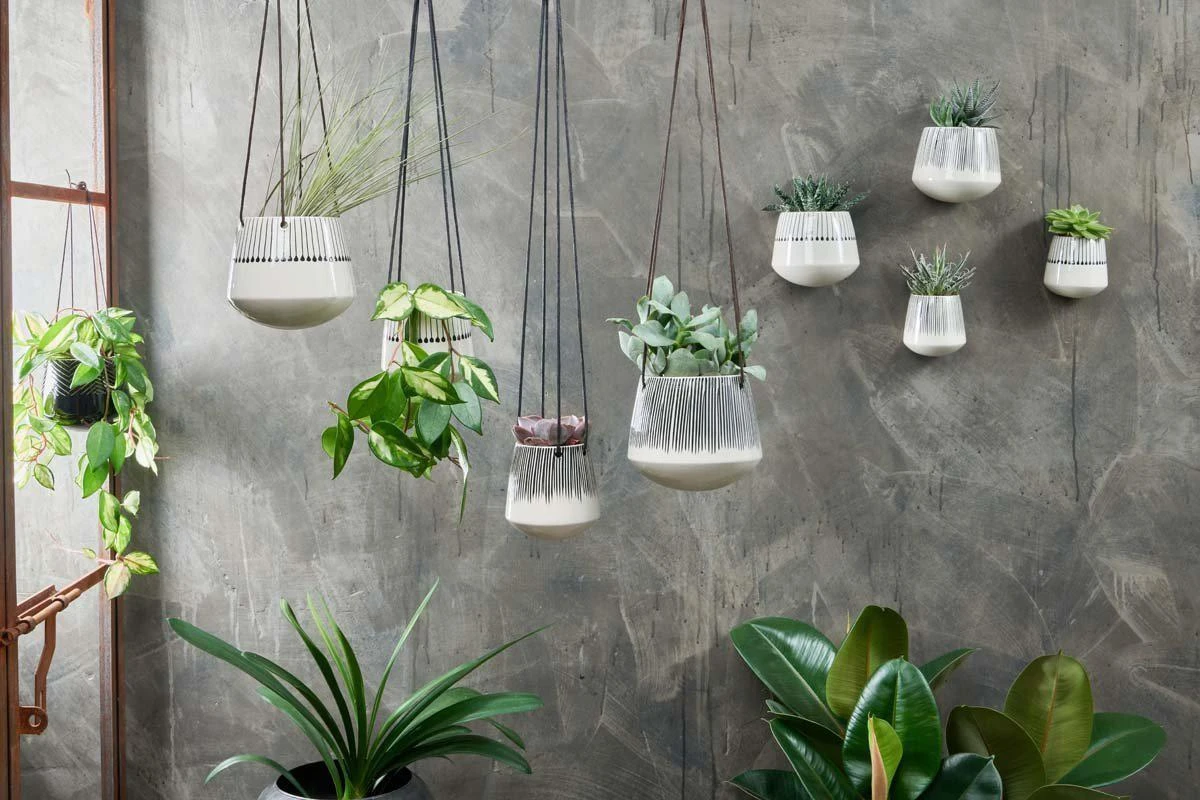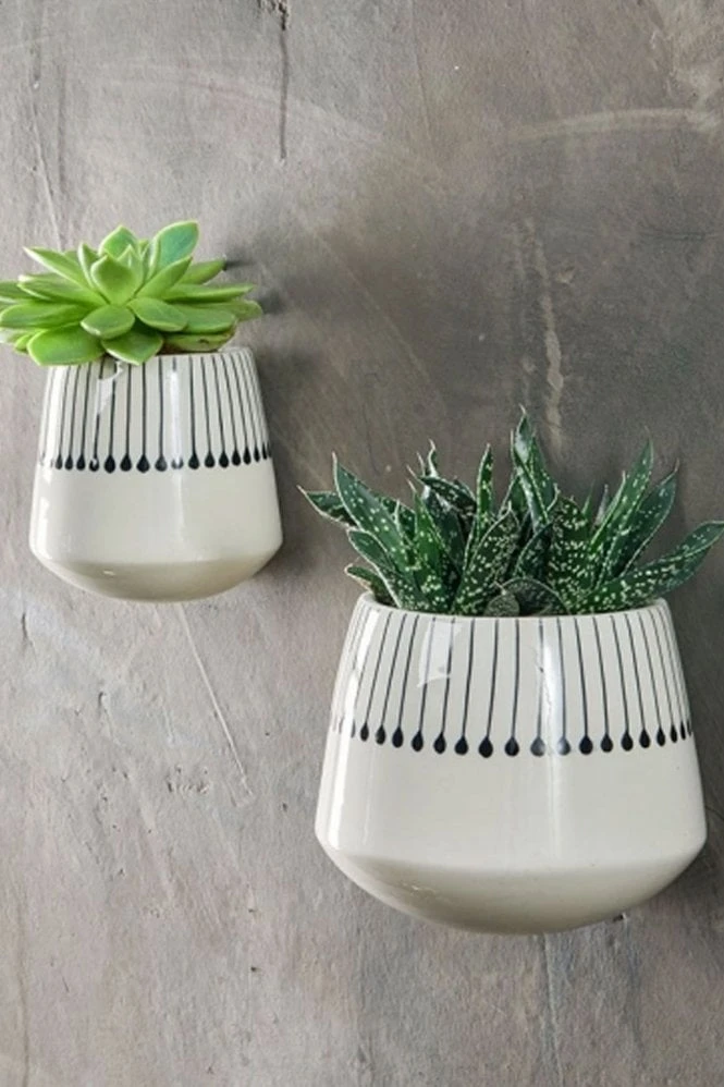 Nkuku Matamba Black Matchsticks design Ceramic Wall Hung Planter Monochrome Hand painted by hand Handmade in Vietnam by skilled artisans Hung on wall hole in back Small – 11 x 10.5 x 9cm Large – 12.5 x 14 x 11cm 41185