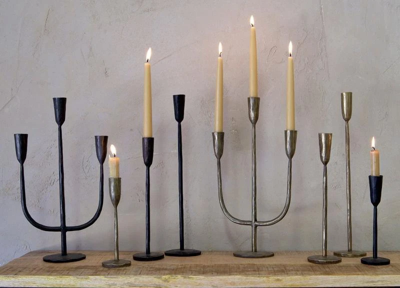 These iron Mbata candlesticks have an elegant stem and artisan looking candle holder that is well suited to a table or sideboard. The rustic finish is skilfully created during the soldering process. This affect adds to the aesthetic of the design and compliments the brass material. Mix and match heights for an attractive display.