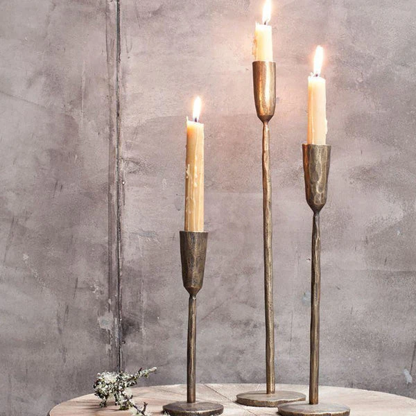 These metal candlesticks have an elegant, long stem and rustic finish that will add a striking feature to any dining table or sideboard. The abstract finish is skilfully created during the soldering process; adding to the aesthetic of the design and complimenting the brass material. Medium Antique Brass Candlestick. Sold individually. Dimensions approx. 30cm x 8cm (Diameter). Made from iron. Colour: Antique brass. Indoor use only. Please note: Skilfully made using traditional techniques. This handmade process means that there are small imperfections and weld marks on each piece, an honest feature that tells the story of how the product is made. Each piece is unique, please expect small variations from photograph.