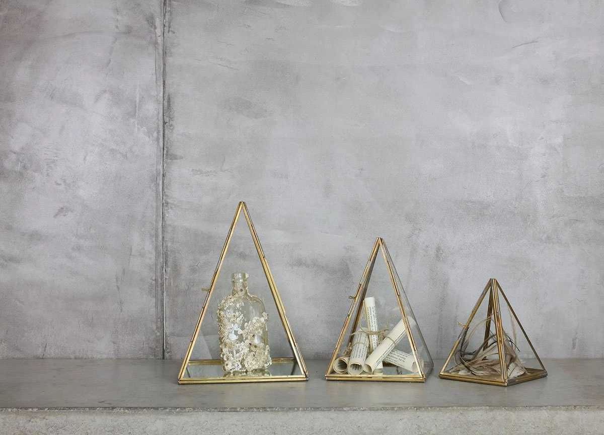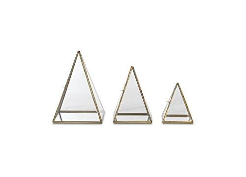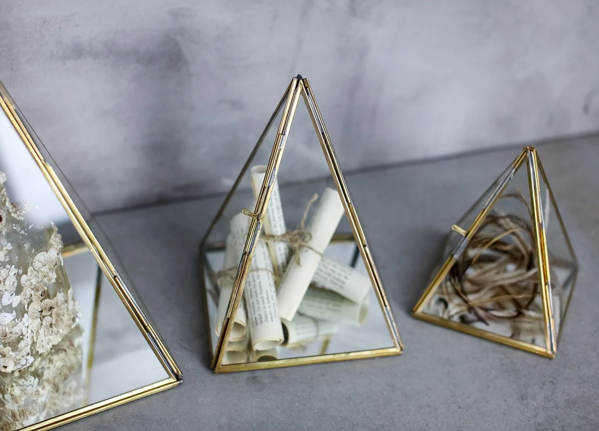 We love this elegant brass pyramid, the beautiful hand forged brass and glass design creates an original and eye catching display case for collectibles, keepsakes and plants. This pretty pyramid shaped display case has an elegant angular shape enhanced by a mirrored base. Fill it with flowers, unique treasures, souvenirs and ornaments and create your own unique showcase.