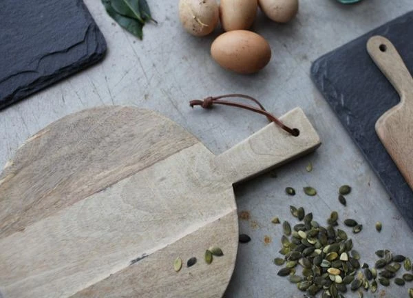 Our gorgeous pizza boards are extremely popular. Each one is handmade from sustainable mango wood by skilled artisans and comes complete with a leather tie. The natural grain and beauty of the wood adds to their style. Great for not only pizzas, but also cheese, antipasti and bread. These wooden pizza boards needn’t only be used for serving pizza. Available in a choice of three sizes they’re perfect for serving sweet or savoury food. To care for your mango wood wash in warm soapy water, rinse and dry immediately. To nourish and protect the natural wood rub an edible oil such as walnut oil into the surface with a cloth (avoid olive oil). Medium 43 x 32 x 2cm Large 59 x 46 x 2cm