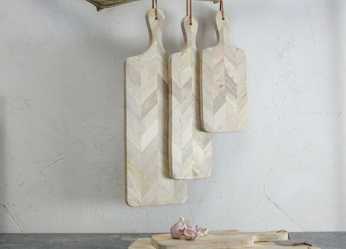 • Handcrafted from sustainably sourced wood, the Nkuku Medium Wooden Nalbari Chopping Board is a durable and eco-friendly addition to your kitchen.