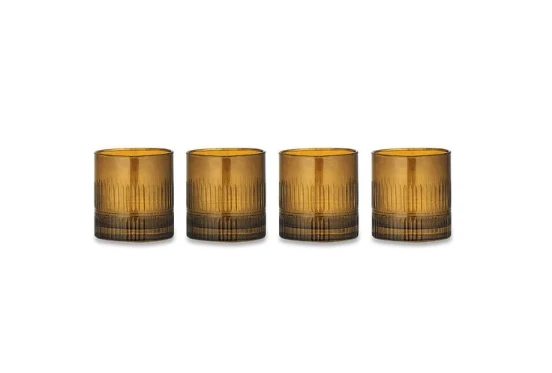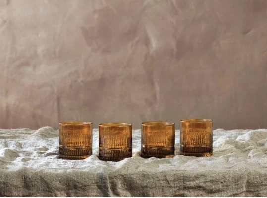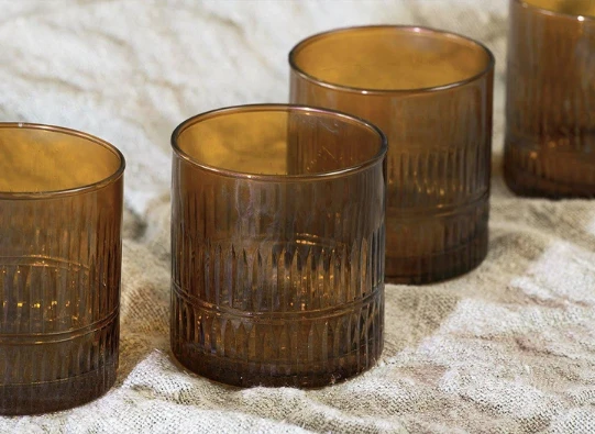 We use recycled glass to make these collections. Firstly, the waste glass is collected and washed to remove any impurities; it ís then crushed and melted down before being hand blown or placed in moulds to create beautiful new products. Colour: Amber Material: Glass Size: 9cm x 8.5 cm Dia Weight: 440g These stylish Mila tumblers have an interesting etched detail and well-proportioned shape. The deep amber tones add to the sophisticated look of this striking collection. Perfect for that relaxing Cocktail (while enjoying our Rewined candles of course) or for that warming Hot Toddy, well it is winter….