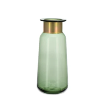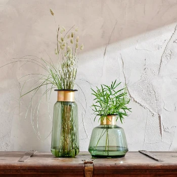 These stunning Miza green glass vases from Nkuku are perfect for displaying flowers and foliage. They are made from recycled glass and have an eye catching brass collar around the neck of the vase. The glass is a beautiful shade of green that enhances the natural tones of the foliage.