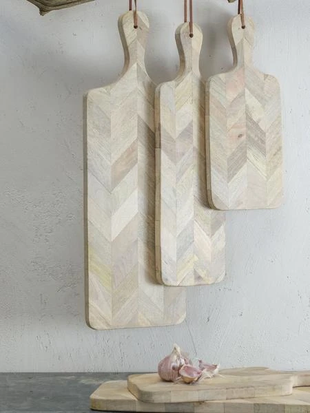 These long, rectangular, Nalbari Chopping Boards are striking and practical. Skilfully pieced together from segments of sustainable mango wood, the natural colour variations create an interesting and texture rich patchwork. Use them as a chopping board or sharing platter for informal delights from antipasti to artisan breads. Large 2 x 60 x 20cm Words of wisdom Our mango wood pieces are created from sustainable mango wood. The Mango trees are initially grown for their fruit, harvested over a number of years. Once the trees have stopped bearing fruit, they can be cut down and used to make our wooden pieces. This allows farmers to plant more trees and provides them with a supplementary income. Food Safe, Dishwasher Safe, Do Not Microwave or Oven Country of origin – India