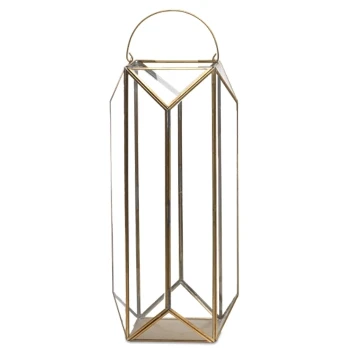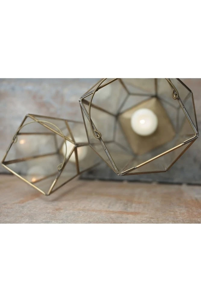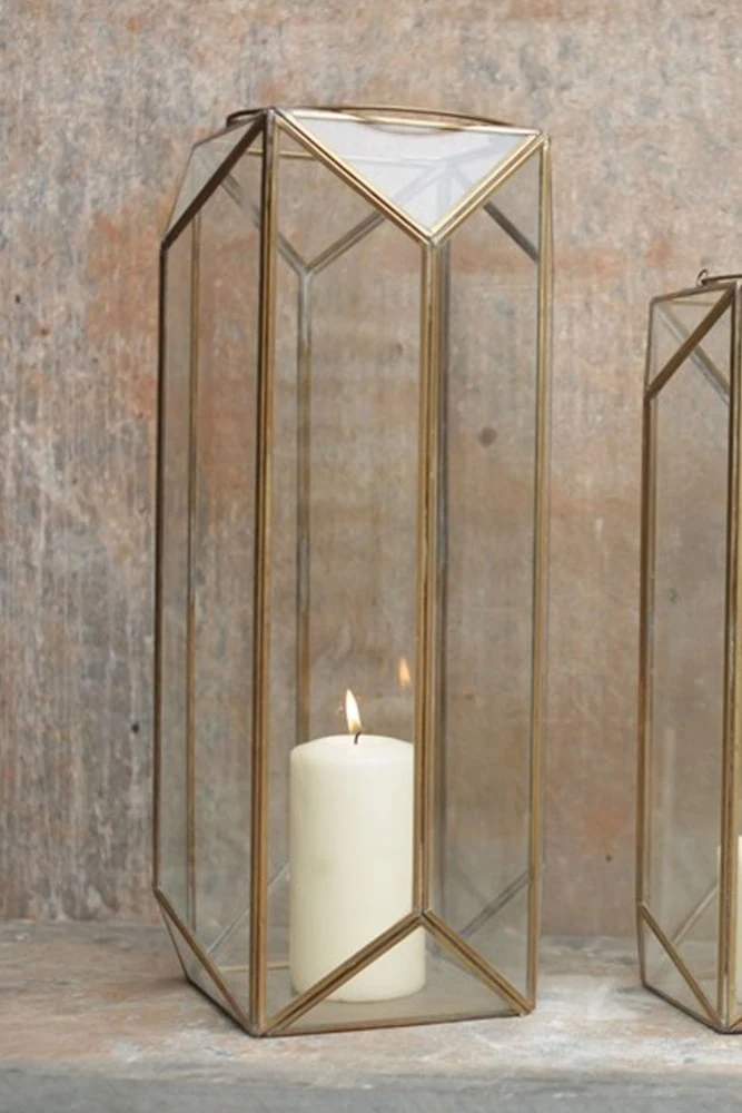 Nkuku Ndiki Lantern Brass Handmade Faceted design Can hold a candle Large 50 x 25 x 25cm Product Code: 26758 Elegant and striking, the ‘Ndiki’ lantern from Nkuku is perfect for adding a cosy glow to the room. Not only a beautiful decorative piece, this handmade lantern can also house a church candle, allowing its soft light to bounce around the room thanks to the large glass faceted panels.