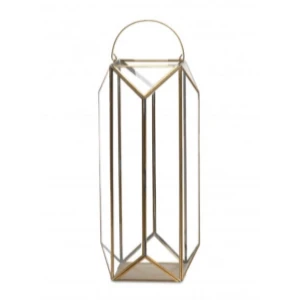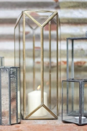 Nkuku Ndiki Lantern Brass Handmade Faceted design Can hold a candle Large 50 x 25 x 25cm Product Code: 26758 Elegant and striking, the Ndiki lantern from Nkuku is perfect for adding a cosy glow to the room. Not only a beautiful decorative piece, this handmade lantern can also house a church candle, allowing its soft light to bounce around the room thanks to the large glass faceted panels.