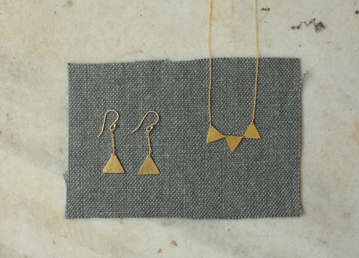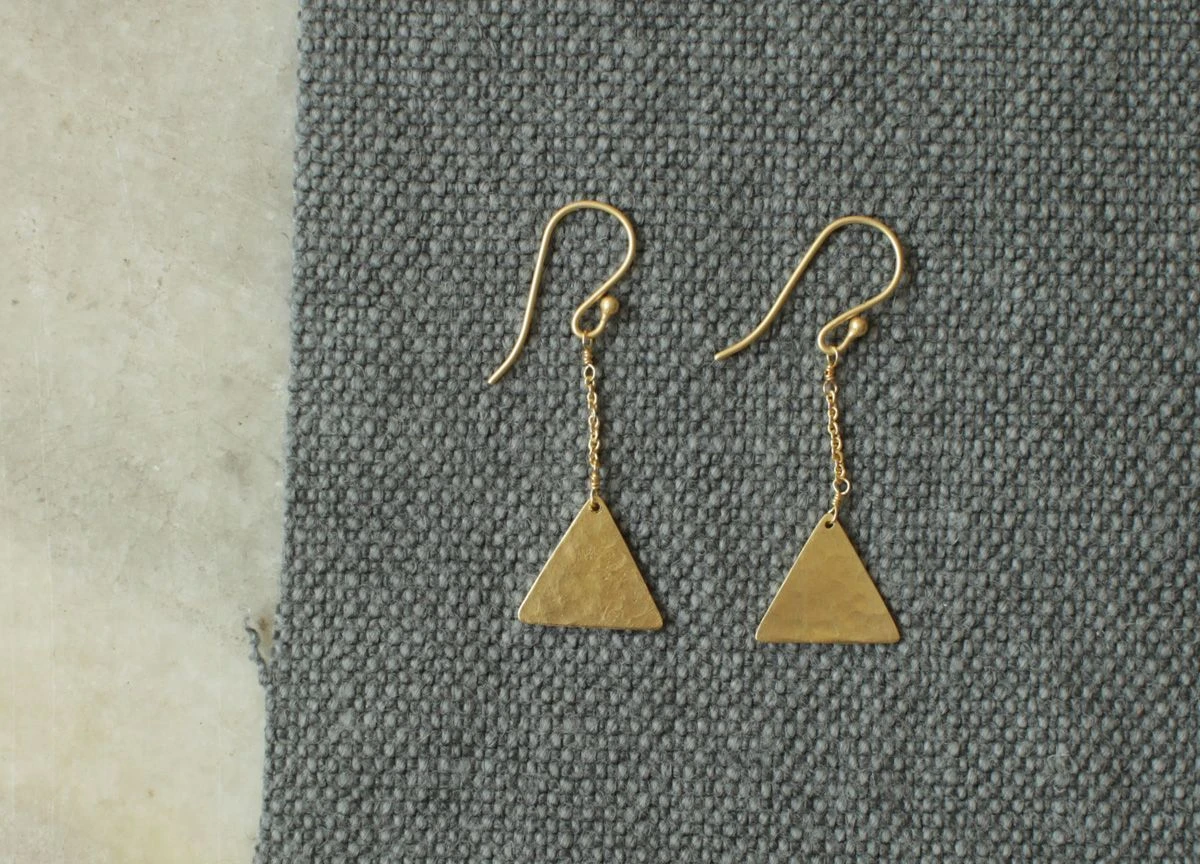 This beautiful Neekala Earrings from Nkuku has been handmade by artisans in Rajasthan. All Nkuku jewellery is handmade for them by a fair trade enterprise. It is made from brass plated in 22 karat gold. The lovely triangle shape has been hammered to create a textured surface to the decoration. A simple but stylish design.