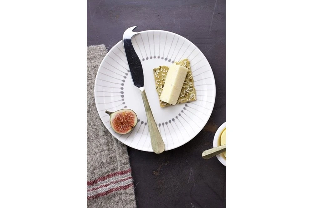 Nkuku Osko Cheese & Butter Knife set Brushed gold Handmade Textured handles Gift boxed Butter Knife 17cm & Cheese Knife 21cm Product Code: 30315 Brushed Gold For elegant entertaining, look no further than the Nkuku Osko Cheese & Butter Knife Set – Brushed Gold. This super stylish duo contains a cheese and butter knife that have been handmade with textured handles and a sleek brushed gold finish. Perfect for serving up a cheese course at the dinner table, we’ll be teaming it with the Bwari Marble Platter – White for a striking look.