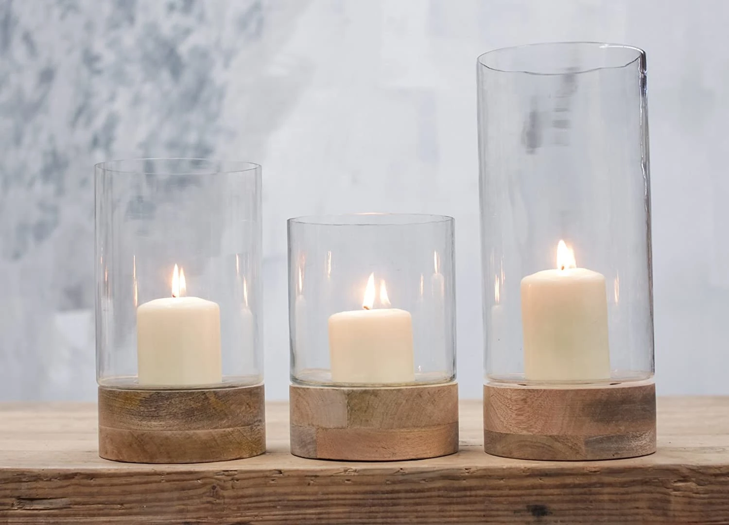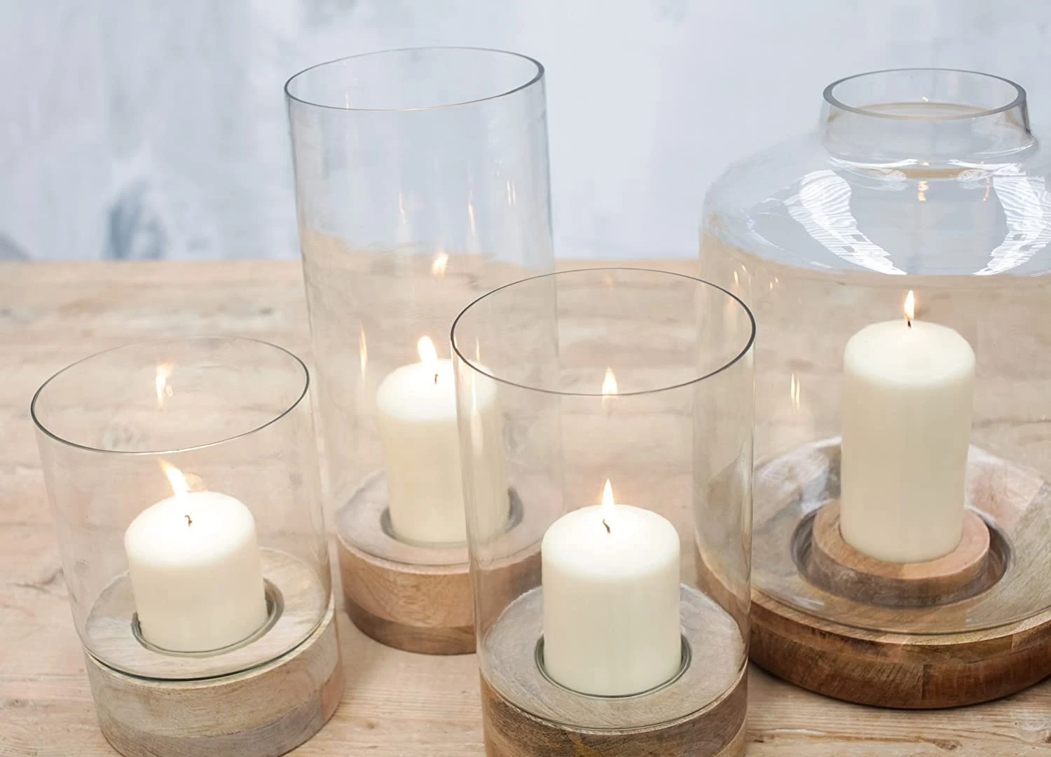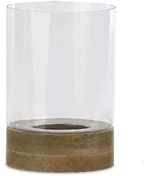 Espectacular porta vela de la marca Nkuku de madera de mango y cristal. Es un porta vela ideal para el centro de una mesa o estantería debido a su grosor. Tiene una base de 6 cm de altura de madera de mango y un cristal grueso de 15 cm de altura. Cabe una vela gruesa de 8 cm de diámetro.