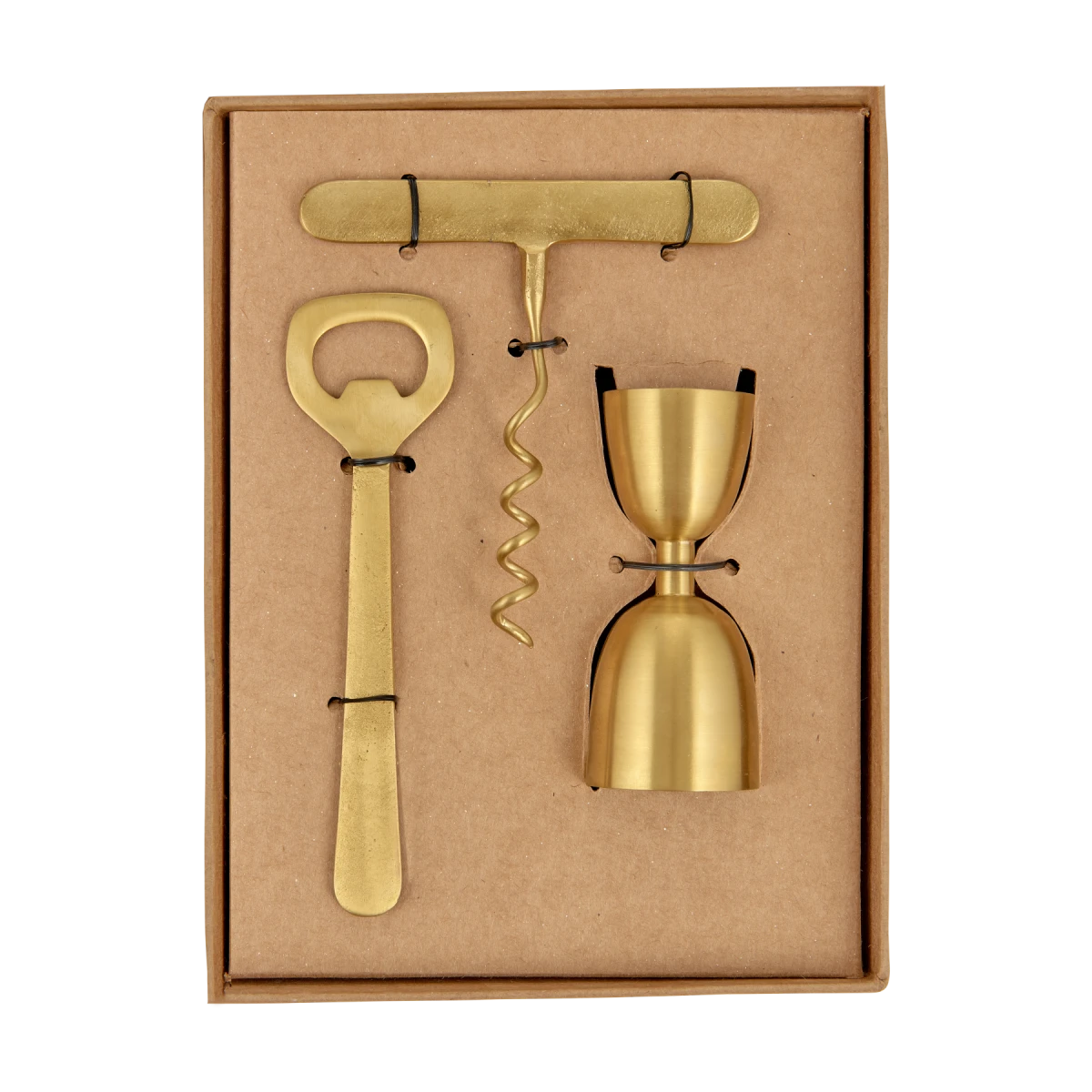 Add a touch of class to your drinks cabinet or trolley with this stunning brass cocktail set. Made from stainless steel and finished in a warm brass, the set includes a cork screw, bottle opener and a drinks measure. Presented in a contemporary gift box, this would also make the perfect gift… if you can bear to part with it. Prefer it shaken and not stirred? Why not pair with the matching Rahuri Cocktail Shaker?