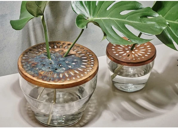 The lid of this elegant Ramla Vase has an antique brass finish, the look is aged antique and the patina is varied. Colour: Clear Material: Glass & Iron Size: 19m x 23.5cm x 23.5cm Weight: 1750g Capacity: 2200ml Our circular Ramla vase is decorated with an antique brass lid. The cut out pattern on the lid is designed to hold the stems of flowers and foliage, creating striking displays.