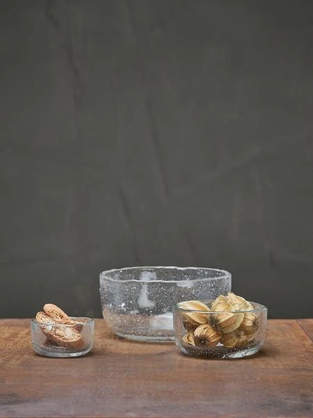 The organic shapes of these chunky Riya glass bowls by NKUKU have a rustic tactile quality. The glass is filled with small bubbles which provide an additional artisan feel. The smallest size looks beautiful filled with dips and olives; the middle size is perfect for ice creams and puddings, whilst the largest size makes an elegant piece of serve ware. These elegant glass bowls have an organic irregular edge. The glass includes small bubbles. 6 x 12cm Dia