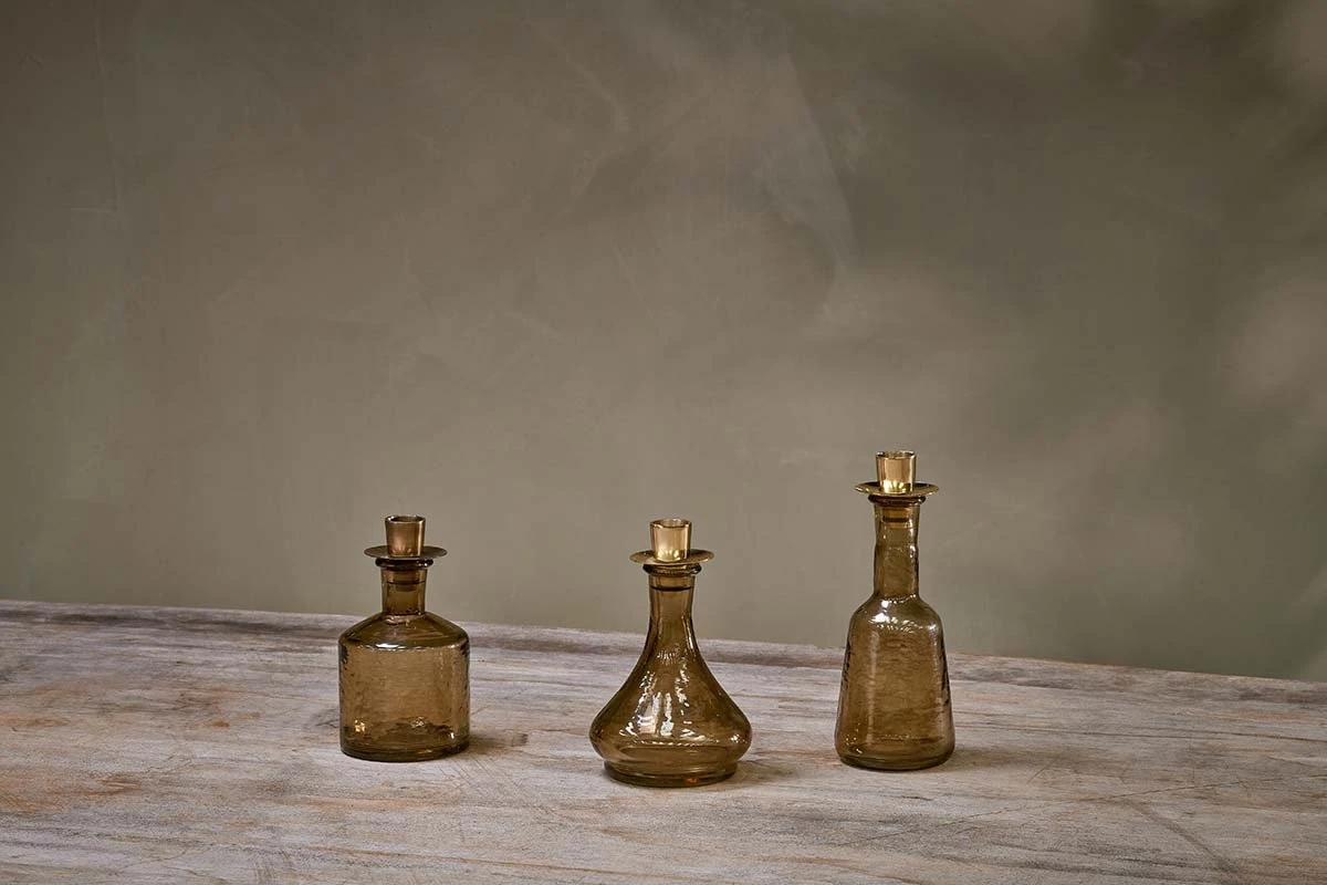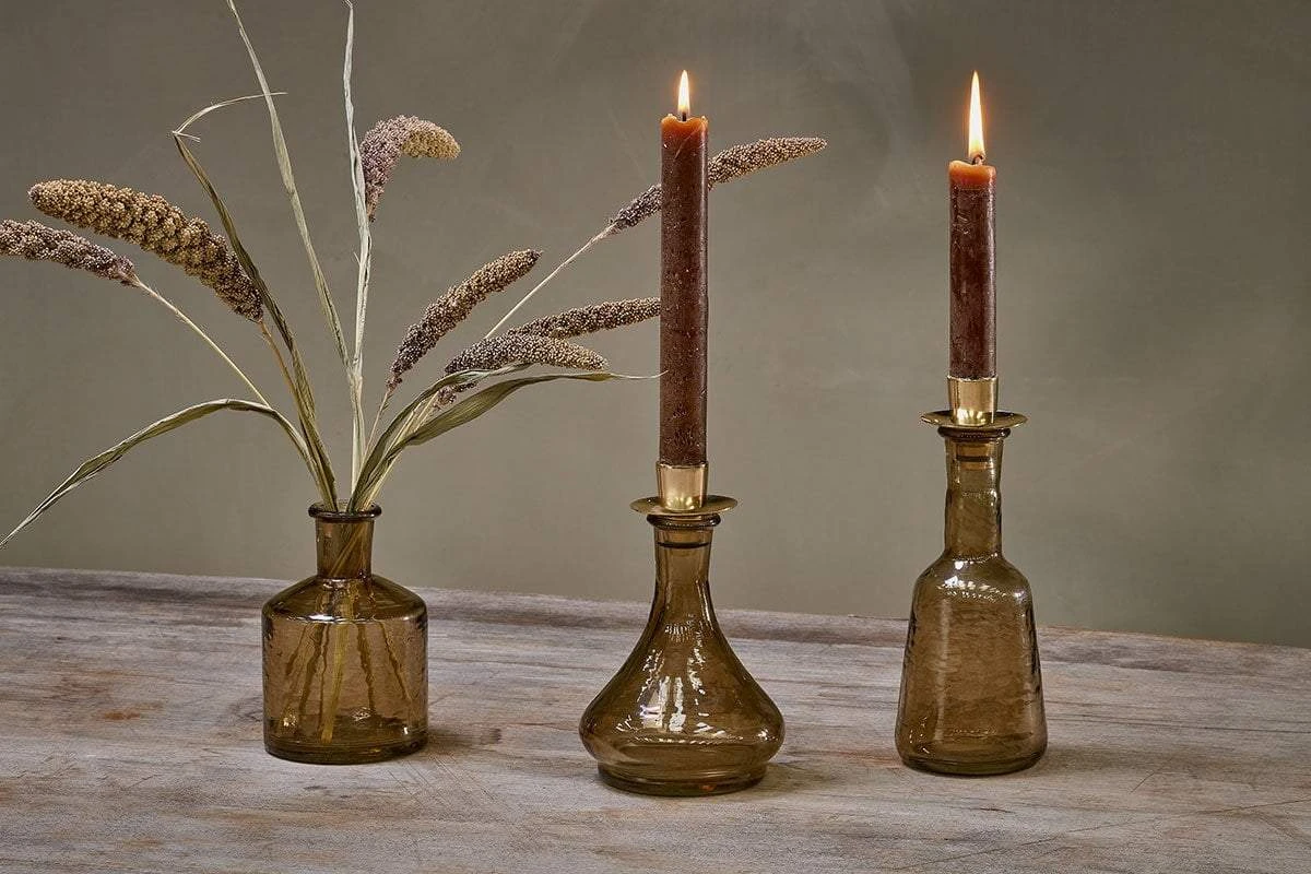 This elegant glass candlestick has a sophisticated sepia colour tone. The simple tapered shape is topped with a removable ‘antique’ brass candle holder that fits a standard dining table candle. The flexibility of removing the holder means that it can also be used as a pretty stem vase. We recommend mixing and matching a few sizes and shapes in the Sirsa collection for an attractive display.