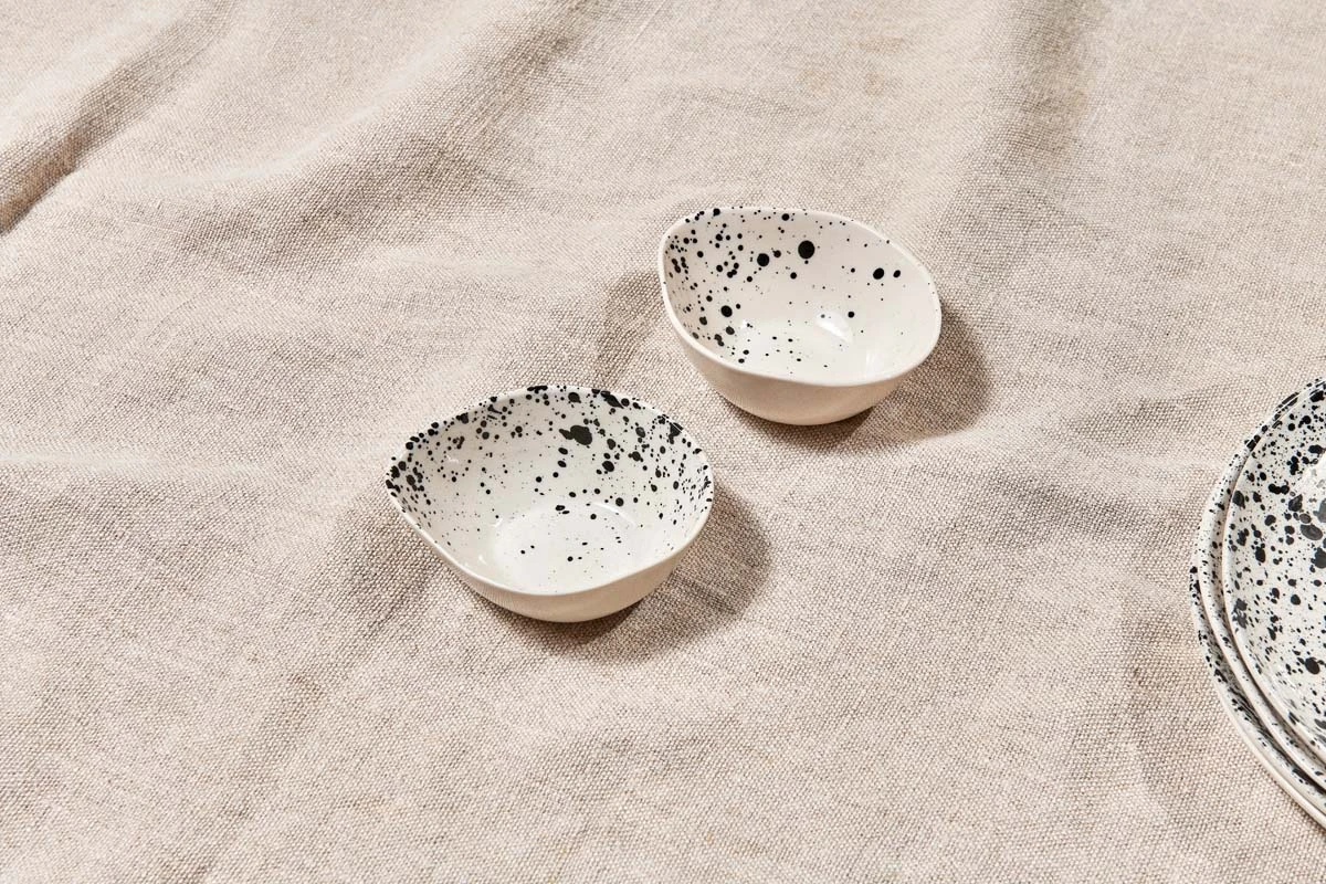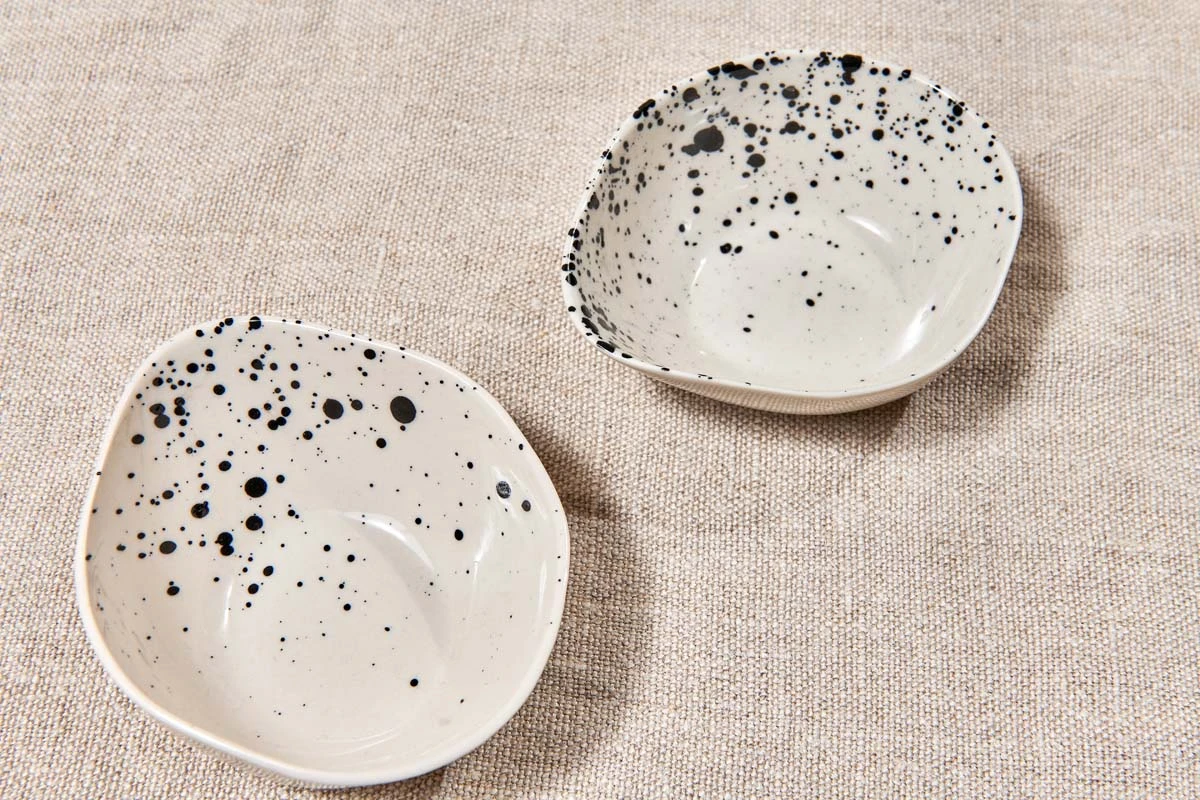 Our Splatter dipping bowls are the perfect size for holding vinegars and oils. The elegant oval design and striking black splatter finish add to their charm. Each one is handmade from stoneware using traditional techniques.