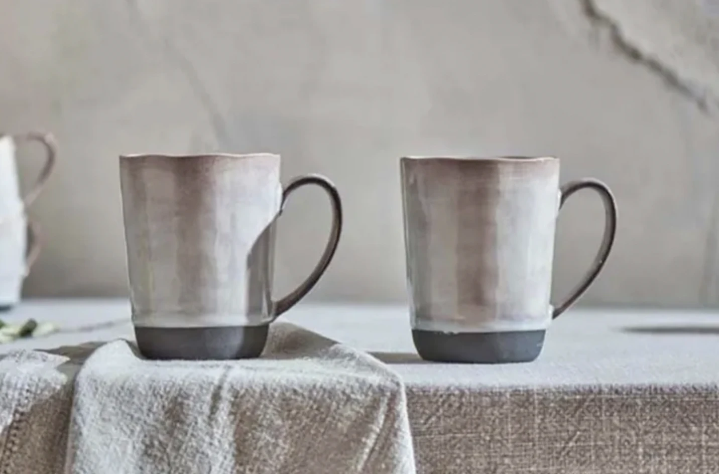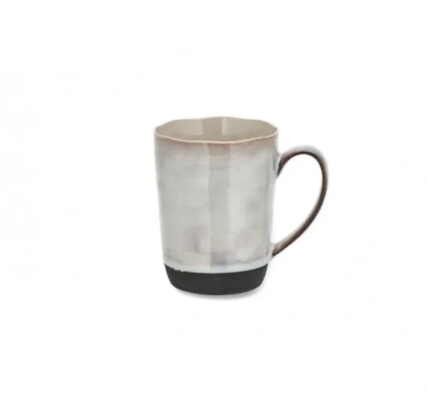The tactile, rustic quality of these tall Edo mugs is created by an earthy palette of textures in subdued slate and an of off -white glaze.