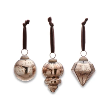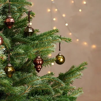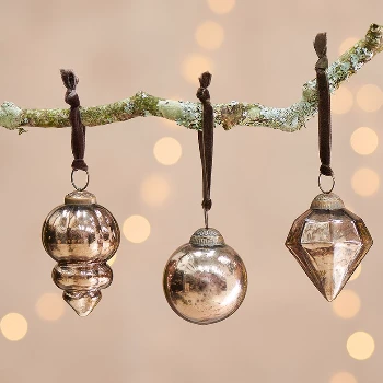 Sophisticated and stylish, the antique smoke hues of Nkuku’s Ura baubles make a striking festive decoration. The set of antique smoke baubles includes three elegant shapes each strung with a brown velvet tie. For a striking display mix all the colours in the collection.