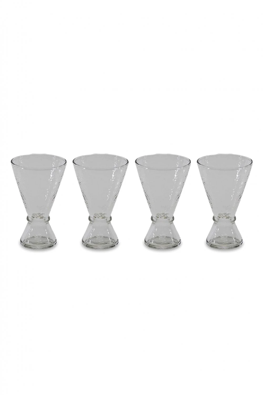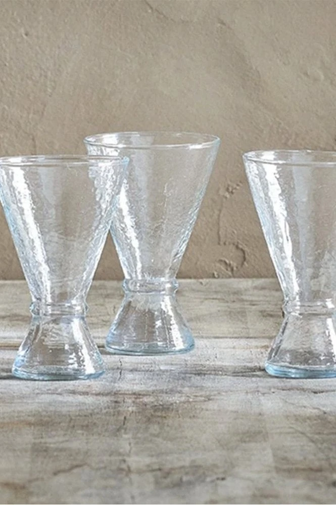 This gift set of large rustic, hand – blown wine glasses is a pleasure to behold. The glasses are hammered when still molten, creating this textured edge that catches the light and adds a tactile quality to each glass. These wine glasses have a unique design, the shape curves in and out in a conical shape.