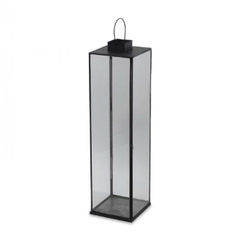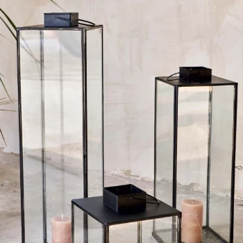 The elegant contours of Nkuku’s Sia lantern are enhanced with the antique black metal finish. This striking frame holds the tall glass panels and provides the perfect silhouette for a church candle or t-light.